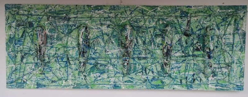 Un jour, en entrant dans l'une de mes forêts préférées, j'ai découvert que tout était détruit. Les beaux et majestueux arbres ont été abattus et emportés, ne laissant que quelques lianes pleureuses. Cette œuvre montre la forêt qui existait autrefois et incorpore certaines de ces vignes et feuilles. C'était un lieu de beauté, de paix et de spiritualité. Il a également joué des fonctions essentielles pour nous tous, pour l'humanité : fournir de l'ombre, de l'eau, de l'énergie, abriter une immense biodiversité et nous protéger du changement climatique. C'est parti maintenant.