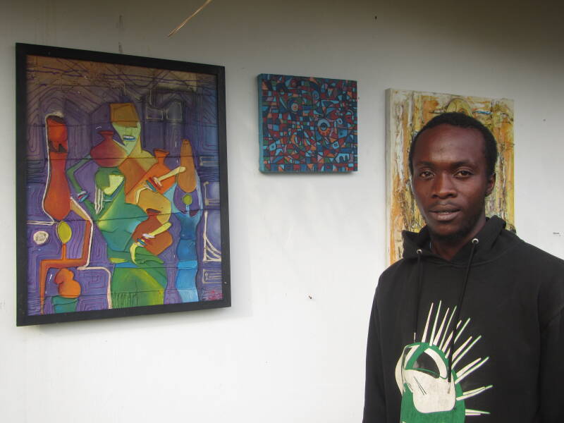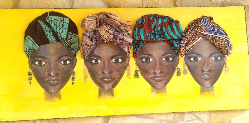.... is a self-taught Cameroonian painter. She produces contemporary works (portrait, landscapes, African scenes in a unique abstract style inspired by her artistic father Mekouti (AfroBantu art gallery). Owner of the Jureinesi gallery, she gives art lessons and sells items made from African fabric.